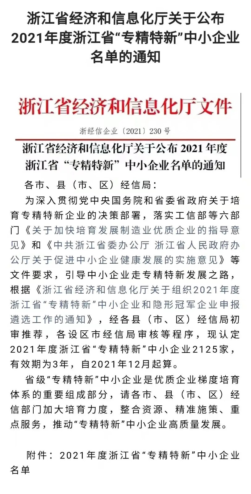 近日,浙江省經(jīng)濟和信息化廳公布了《浙江省經(jīng)濟和信息化廳關(guān)于公布2021年度浙江省“專精特新”中小企業(yè)名單的通知》,浙江東睦科達(dá)磁電有限公司被認(rèn)定為2021年度浙江省“專精特新”中小企業(yè)。
