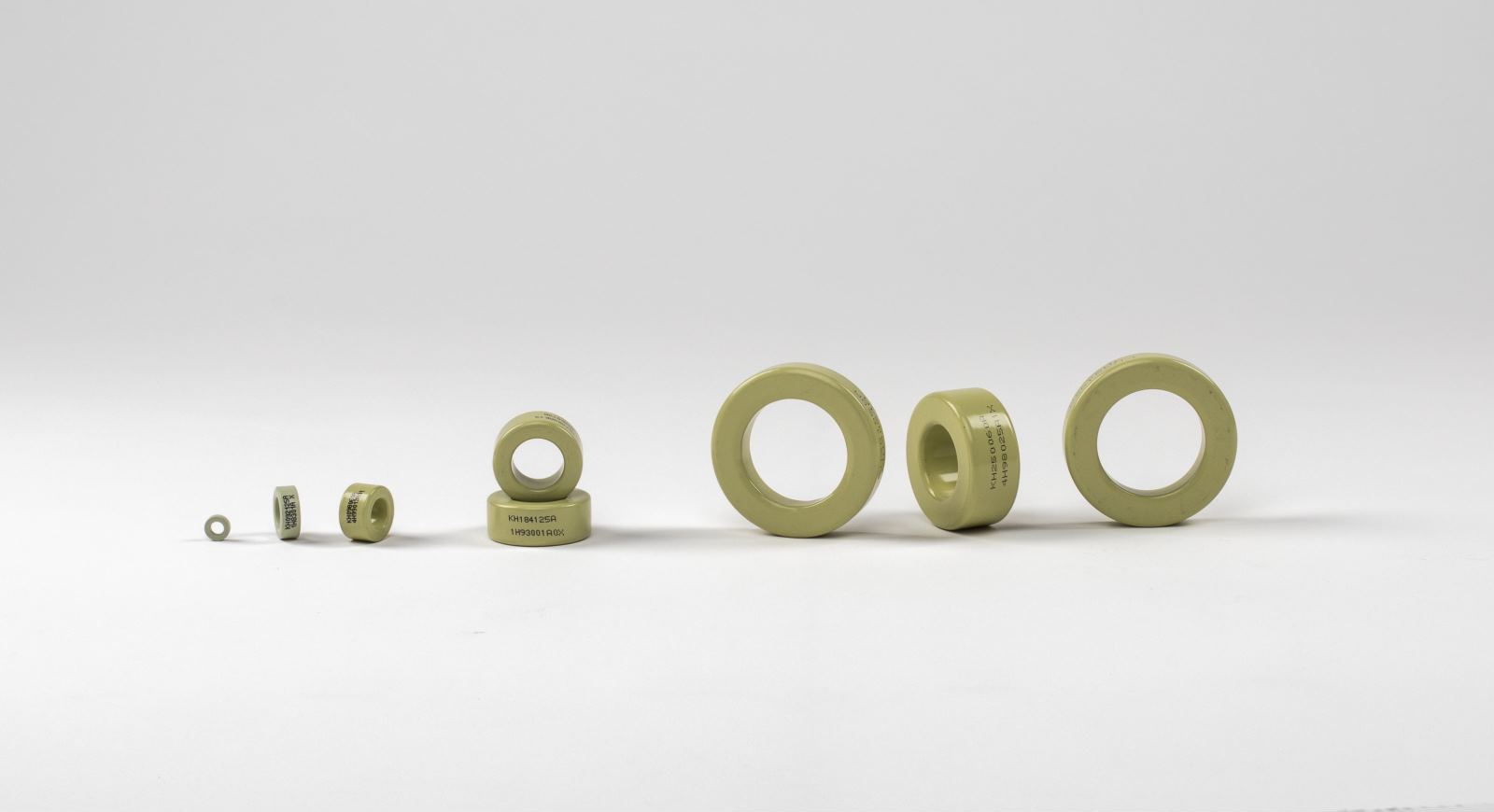 鐵鎳磁粉芯(KH)是由50%Fe和50%Ni的合金粉末制成的金屬粉末磁芯,也稱(chēng)高磁通磁粉芯,在所有的粉末材料中,鐵鎳磁粉芯具有較好的DC偏置能力,高飽和磁通密度(15000高斯)和低磁芯損耗高儲(chǔ)能特性,非常適用于大功率、大直流偏置的應(yīng)用,如調(diào)光電感器,回掃變壓器、在線(xiàn)噪音濾波器、脈沖變壓器和功率回?cái)?shù)校正電感器等。